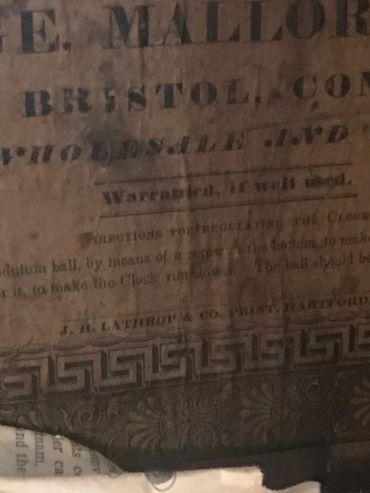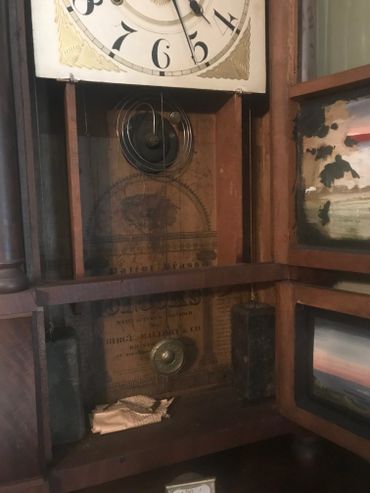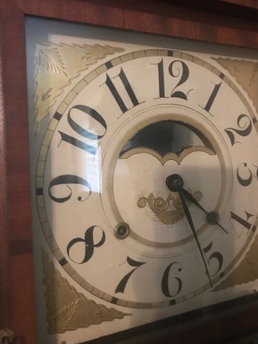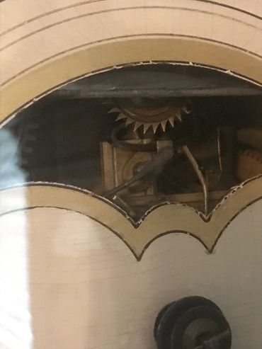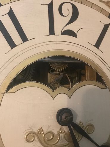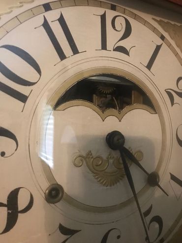 In the early 19th century clock makers started using brass movements that ran for 8 days . In order to display that their clock had one of these movements and not one of the old wood movements they put in a viewing hole. below the 12 o'clock position is a crescent shape design opening with a small looking glass. A rod behind the top decoration is lifted to pull up mirror to show off the modern brass movement. This way you knew you were getting the latest in technology!